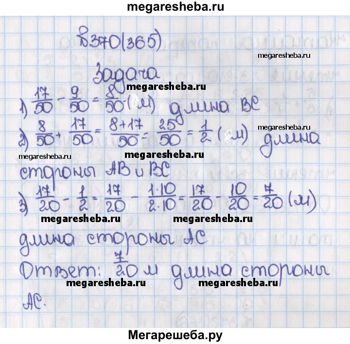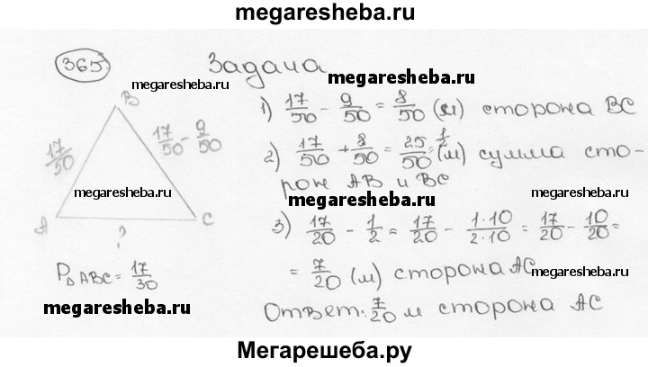 365. Периметр треугольника ABC равен 17/20 м. Сторона АВ равна 17 м, сторона ВС на 9/50 м короче АВ. Найдите длину стороны АС.